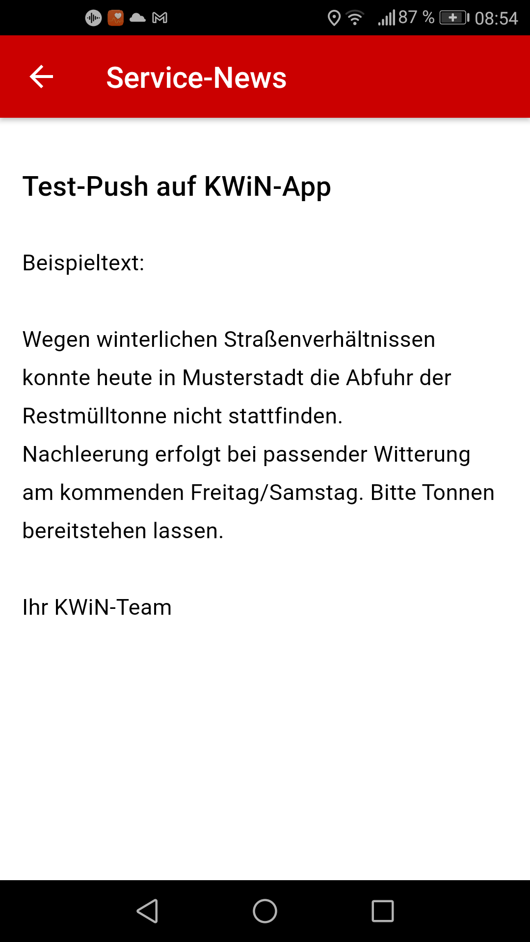 Die Installation ist, wie es sich für eine moderne App gehört, einfach und selbsterklärend. Lediglich die genaue Adresse muss eingegeben werden, anschließend kann der Nutzer verschiedene Optionen auswählen. Neben den bereits erklärten Funktionen, in der Hauptsache eben die Erinnerung an die Abfuhrtermine und das Abfall-ABC, dürfte für viele Anwender auch die Funktion „News“ von großem Nutzen sein. Hier wird man direkt auf die Rubrik „Aktuelles“ der KWiN- bzw. AWN-Homepage geleitet – dort sind alle wichtigen Unternehmensneuigkeiten wie beispielsweise, ganz aktuell, Änderungen in Bezug auf die geltenden Corona-Schutzmaßnahmen, Öffnungszeiten über Feiertage, Verschiebung von Abfuhrterminen aus den verschiedensten Gründen und sonstiges Wissenswertes zu finden. Die App hält somit immer auf dem neuesten Stand. Wenn unter Einstellungen die Funktion "Push-Nachrichten" aktiviert ist (Standardeinstellung), kann der Anwender auch Nachrichten über kurzfristigen Änderungen von der KWiN erhalten. Diese Push-Funktion kann lokal und sogar „straßenscharf“ versandt werden.