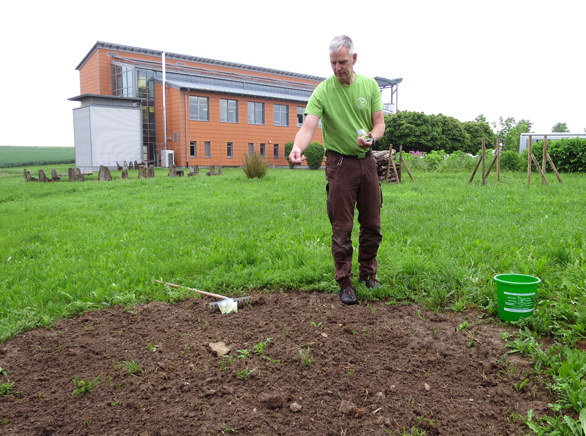 Die Fotos zeigen: AWO-Aufsichtsratsvorsitzende Neckar-Odenwald, Gabriele Teichmann, überreicht das Aktionsschreiben mit Blumensamen an AWN-Geschäftsführer Dr. Mathias Ginter. Mitarbeiter Christian Gramlich kümmert sich um das Blumenbeet.