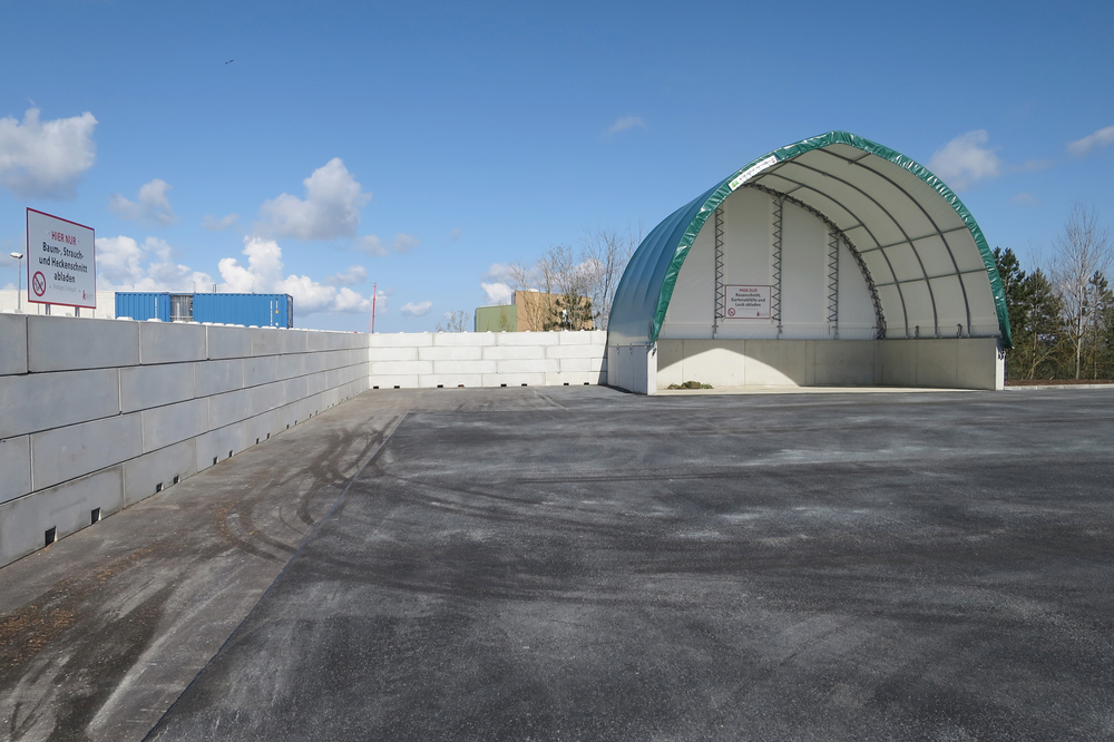 Der Platz besteht aus einer asphaltierten Fläche von 1.300 qm. Das krautige Material (Rasenschnitt, Gartenabfälle und Laub) wird in einer Rundbogenhalle abgeladen. Das Material ist somit vor Niederschlagswasser geschützt, was Auswaschungen verhindert. Für holziges Material (Baum-, Strauch- und Heckenschnitt) steht eine eigene Lagerfläche zur Verfügung, die Entwässerung erfolgt im Trennsystem. Aufgrund der großzügigen Platzverhältnisse können mehrere Anlieferer gleichzeitig abladen.
