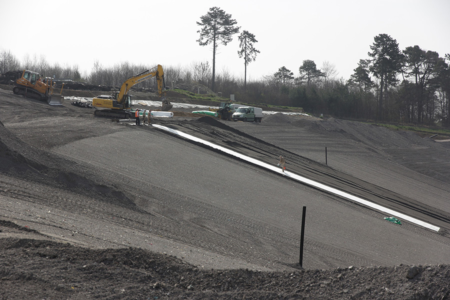 Ganze acht verschiedene Schichten sind für die Oberflächenabdichtung einer Deponie notwendig: Auf die bisher vorhandene mineralische Abdeckung folgt eine Gasdrän- und Stützschicht aus aufbereiteter Müllverbrennungsschlacke, die aufgrund ihrer Schwarzanthrazitfarbe an einen Lanzarote-Strand erinnert. Die darauf folgende feine mineralische Auflageschicht bildet das Bett für die weiße Geosynthetische Tondichtungsbahn (GTD), eine Art dichtes Flies. Darauf kommt die extrem stabile schwarze Kunststoffdichtungsbahn (KDB), die 2,5 mm stark und wasser- und gasdicht ist. Zum Schutz dieser Bahn von oben folgt ein weißes Schutzflies, dann eine Entwässerungsschicht aus Kies, danach ein weiteres Schutzflies. Zum Schluss folgt ein 2,5 Meter starker Rekultivierungsboden, der dann am Ende bepflanzt werden soll.