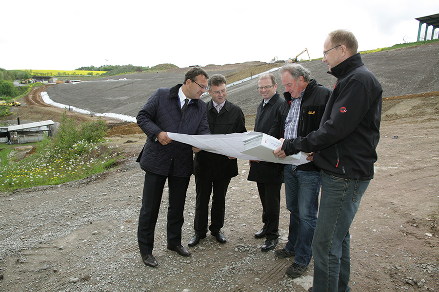 Dieser Tage informierten sich Landrat Dr. Achim Brötel und Kreiskämmerer Michael Schork (2. und 3. von links) über die umfangreichen Bauarbeiten aus der Deponie Sansenhecken, die von AWN-Geschäftsfürer Dr. Mathias Ginter, Deponieleiter Hubert Kieser und technischem Leiter Harald Schäfer (von links) erläutert wurden.