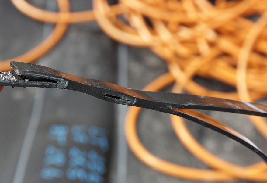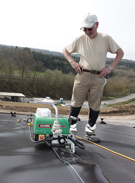 Die 2,5 mm starke Kunststoffdichtungsbahn (KDB) wird mit rund 300 °C verschweißt. Anschließend prüft man den Schweißkanal mit einem Überdruck von 5 bar auf Dichtigkeit.