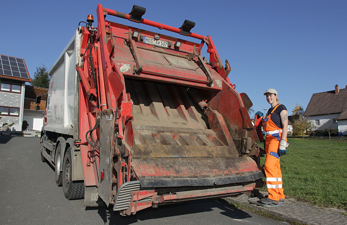 Da muss man schon zwei Mal hingucken, wenn man die adrette junge Frau hinten auf dem Müllfahrzeug stehen sieht. Lange, blonde Haare, zu einem Pferdeschwanz zusammengebunden, sympathisches Lächeln. Angélique Hoffmann heißt die junge Frau aus Osterburken, die bei der AWN arbeitet.