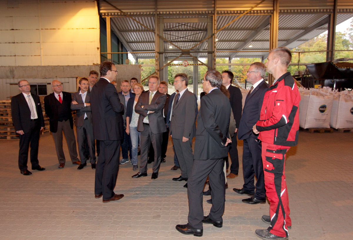 Beim anschließenden Rundgang über das im Bau befindliche Biomassezentrum, Herzstück ist die Anlage zur Herstellung von hochwertiger Pflanzenkohle, konnte sich der Umweltminister über die lokalen Gegebenheiten informieren. Über 26.000 Tonnen Grüngut, so Dr. Ginter, fallen im NOK jährlich an. Der holzige Anteil des Grüngutes wird als Biobrennstoff vermarktet oder diene der Herstellung von hochwertiger Pflanzenkohle. Das krautige Material wird in Kompostierungs- bzw. Hygienisierungsprozessen zu „normalem“ Kompost oder hochwertigem Nährhumus weiterverarbeitet. Weitere geplante Verfahrensschritte seien die Herstellung von Kohlekompost (Terra Preta) und Komposttee. AWN-Mitarbeiter Christian Gramlich erläuterte abschließend der Besuchergruppe die Funktionsweise der Pflanzenkohleanlage.