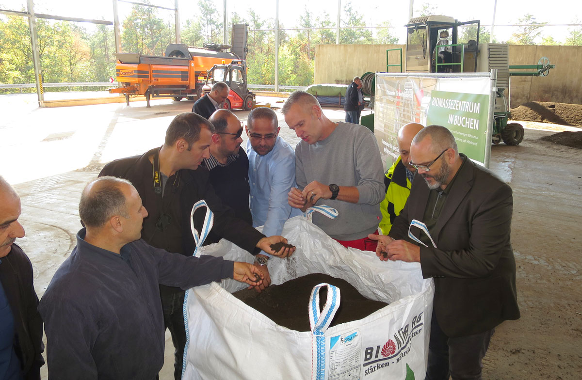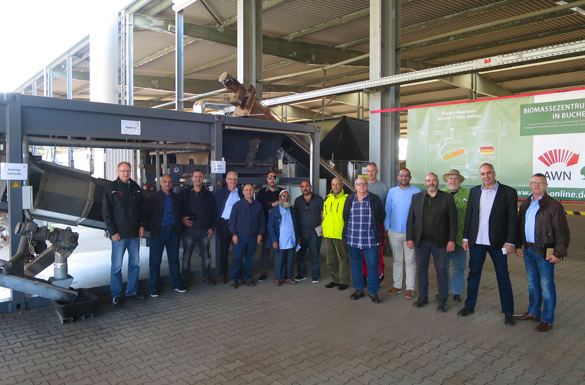 Dem entsprechend war die Reisegruppe auch hochkarätig besetzt: Neben Vertretern des jordanischen Landwirtschaftsministeriums und der Wasserbehörde waren ebenso Techniker und Wissenschaftler mit dabei. Betreut wurde die Gruppe von Technischem Leiter Harald Schäfer und Martin Hahn, Leiter Unternehmenskommunikation. Besonderes Interesse fand die Anlage zur Herstellung von Pflanzenkohle (Pyreg) im Biomassezentrum der AWN: Aus „normalen“ Hackschnitzeln wird hochwertige Pflanzenkohle produziert, die vielfältige Verwendung in der Landwirtschaft und Technik findet. Genauso informierte sich die Besuchergruppe über die Herstellung von Nährhumus aus Materialien, die so durchaus auch in Jordanien zur Verfügung stehen würden. Als weiteren Vorteil erläuterten Christian Gramlich vom Biomassezentrum, dass landwirtschaftliche Flächen, die entsprechend mit Nährhumus versorgt sind, mit deutlich weniger Wasser bewirtschaftet werden können. Für eine Wüstenregion, so stellten die Besucher fest, ein erheblicher Vorteil.