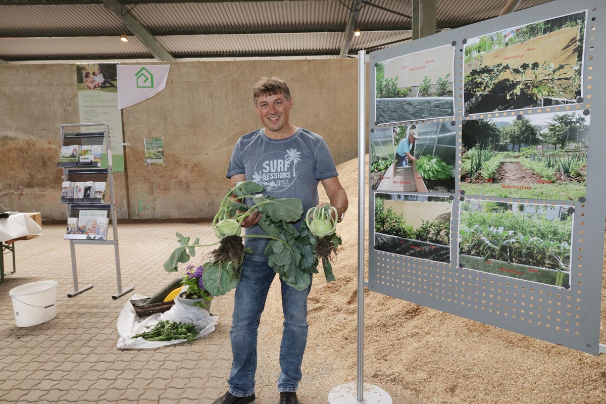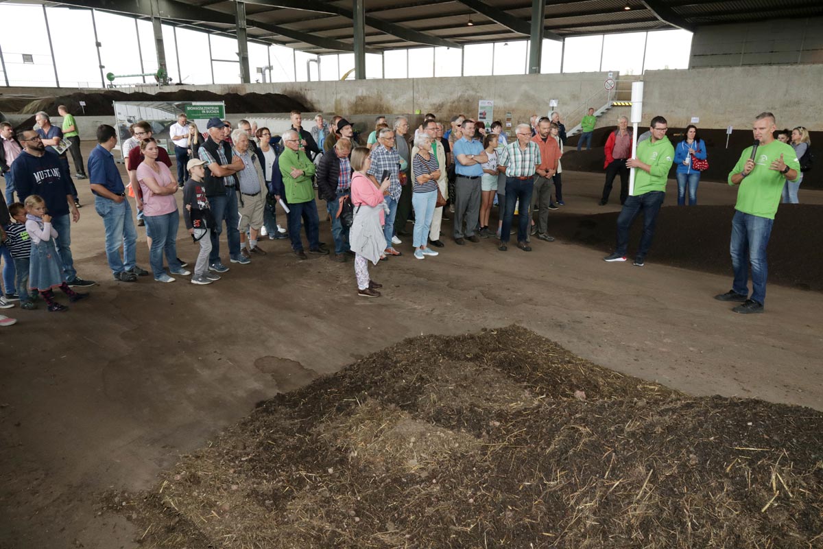 Besonderes Highlight war der Bereich „Nährhumus“: Hier konnte man sehen, dass aus ausschließlich regionalen und natürlichen Materialien wie holzigem Strukturmaterial, frischem Grün, Mist und Tonerde eine Nährhumus von ausgesprochen hoher Qualität entsteht. Gramlich und Müller betonten, dass man dieses Material nicht nur als Dünger, sondern vielmehr als Bodenverbesserer, Mittel zum Humusaufbaues und somit als wichtigen Bestandteil für die Bodengesundheit sehe. Dieses Verfahren der „gelenkten aeroben Kompostierung nach Hildebrandt“ liefert einen Humus, der die Pflanzenwirkstoffe fest gebunden aber pflanzenverfügbar bereitstelle. Dieser Effekt besteht auf Dauer, die Wirkstoffe werden auch nicht ausgewaschen. Praxisnah wurde den Besuchern gezeigt, wie mit dem Spezial-Kompostwender „Gujer“, gelenkt von Mitarbeiter Sascha Heffner, die typische Dreieck-Pyramidenform der Humusmieten entsteht.
