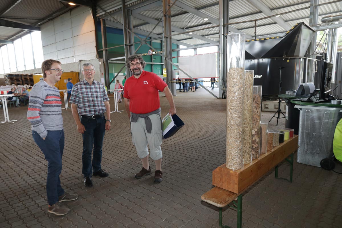 Beim Infostand des Verbandes Wohneigentum konnte man sich auch gleich über die überaus positive Wirkung von diesem Humus informieren lassen. Im Rahmen eines Feldversuches hatte die AWN zu Beginn der Gartensaison eine größere Menge an Nährhumus zu Versuchszwecken zur Verfügung gestellt. Die Gartenfreunde hatten dann verschiedene Beete unter der Vorgabe „mit“ und „ohne“ Nährhumus angelegt. Die Ergebnisse, zu sehen an echten Pflanzen und auch auf Fotos, konnten von den Besuchern bestaunt werden. Somit wurde dann auch die Möglichkeit für alle Besucher, kostenlos Proben von diesem Nährhumus und auch Nährhumus mit Pflanzenkohle (Terra Preta) mitzunehmen, gerne wahrgenommen. Abschluß des Rundgangs war die Pyreg-Anlage. Hier werden knapp 800 Tonnen geeignete Hackschnitzel regionaler Herkunft zu ca. 200 Tonnen hochwertige Pflanzenkohle verarbeitet werden. Diese wird, so die Infos, für Edelkomposte wie Terra Preta, als Stalleinstreu oder Futtermittelzusatz weiterverwendet. Von hier aus liefert man die höchste Qualität nach dem europaweit gültigem EBC-Zertifikat „Premium Futterqualität“. Am Ende der Führung wurde noch darauf hingewiesen, dass das Material (Nährhumus, Kompost, Hackschnitzel, Pflanzenkohle) auch gekauft werden kann. Info gibt es unter www.awn-online.de/biomassezentrum.