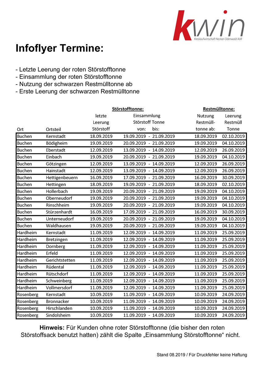 - Nach Verteilung der Restmülltonnen dürfen dann die roten Störstoffsäcke nicht mehr zur Abholung bereitgestellt werden. Sie können diese anderweitig verwenden. Die letzte Abholung/Leerung der Störstoffsäcke/-tonnen in Buchen ist zwischen dem 10. und 19. September (je nach Ortsteil, siehe Infoflyer Termine, Spalte „letzte Leerung Störstoff“), ab dann die neuen Restmülltonnen benutzen. Deren erste Leerung findet zwischen dem 24.09. und 4.10. (je nach Ortsteil, siehe Infoflyer Termine, Spalte „Leerung Restmülltonne“) statt.