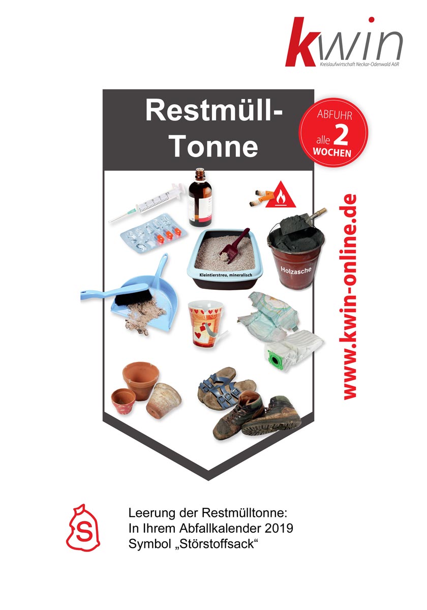 - In den Wochen vom 02. bis 18. September 2019 bekommt jeder Gebührenhaushalt eine neue schwarze Restmülltonne zugestellt. Die Größe richtet sich nach der aktuell entrichteten Müllgebühr und somit nach der Größe der Bioenergietonne. Im Deckel der neuen Restmülltonne klemmt dann nochmal der Infoflyer Termine.