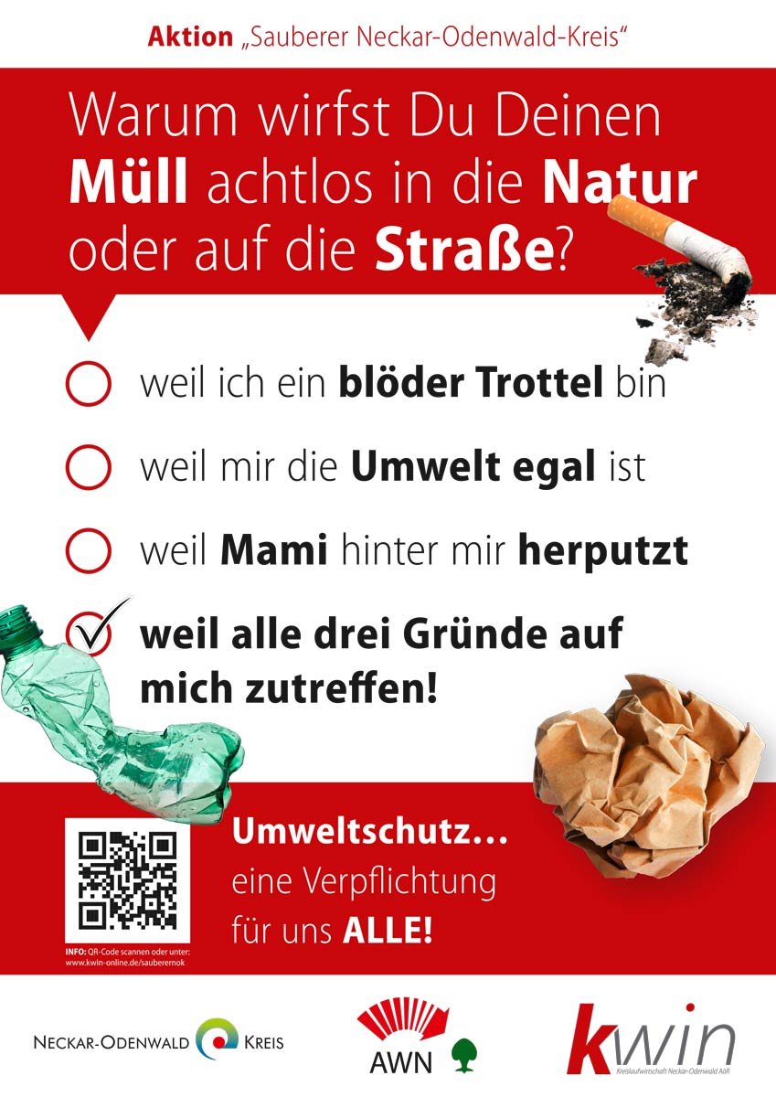Die Aktion Sauberer NOK will auf diese Missstände hinweisen. An Stellen, die immer wieder vermüllt werden, sollen Plakate eine provokante Botschaft an die Müllverursacher weitergeben und hoffentlich auch an das Gewissen appellieren: „Warum wirfst Du Deinen Müll achtlos in die Natur oder auf die Straße? Weil ich ein blöder Trottel bin oder weil mir die Umwelt egal ist oder weil Mami hinter mir herputzt oder weil alle drei Gründe auf mich zutreffen“. Kreisweit sollen so mehrere hundert Plakate verteilt und platziert werden.