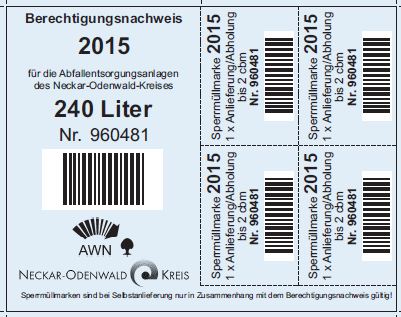 Wie bereits in den vergangenen Jahren sind dem Gebührenbescheid nur noch zwei Marken beigelegt, nämlich der Berechtigungsnachweis und die Sperrmüllmarke(n). Die früher übliche Kontrollmarke für die Restmülltonne gibt es nicht mehr.
