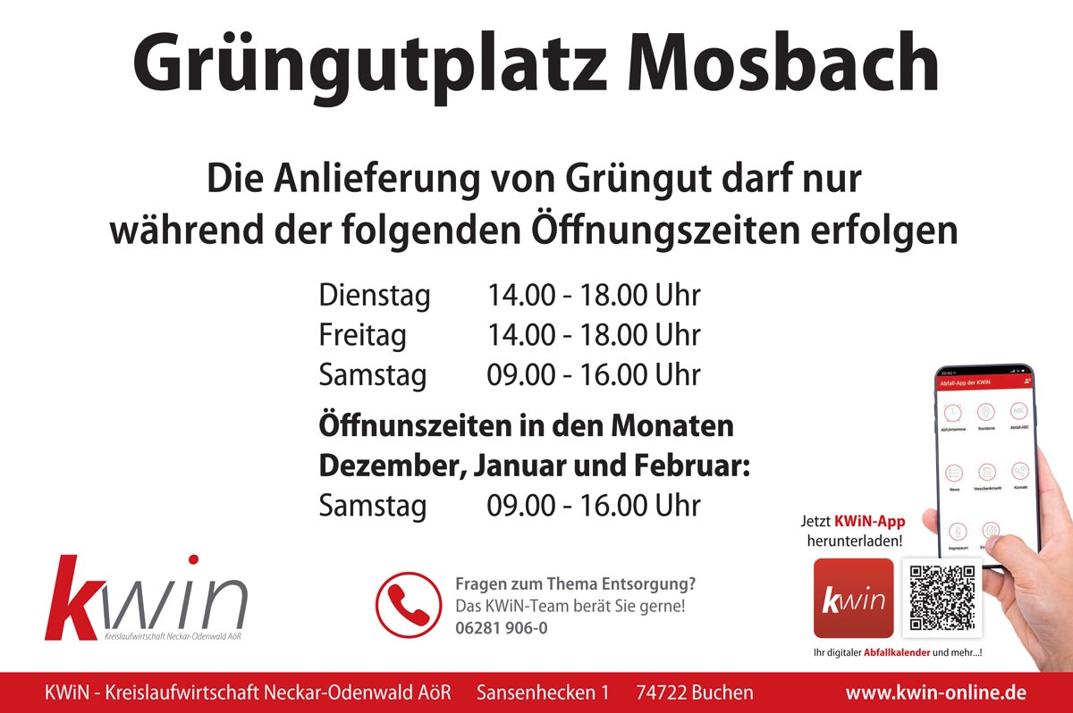 2021-10-21. Der neue leistungsfähige Grüngutplatz in Mosbach „Am Eisweiher“ wurde diese Woche im Rahmen eines Pressetermins seiner Bestimmung übergeben – ausführlicher Bericht folgt. Dieser öffnet am Freitag, 22.10.2021 - folgende Öffnungszeiten sind geplant: Dienstag und Freitag von 14 - 18 Uhr, Samstag von 9 - 16 Uhr, in den Wintermonaten Dezember, Januar und Februar nur samstags von 9 – 16 Uhr. Der bisherige Grüngutplatz Bergfeld ist somit ab Montag, 25.10., auf Dauer geschlossen.